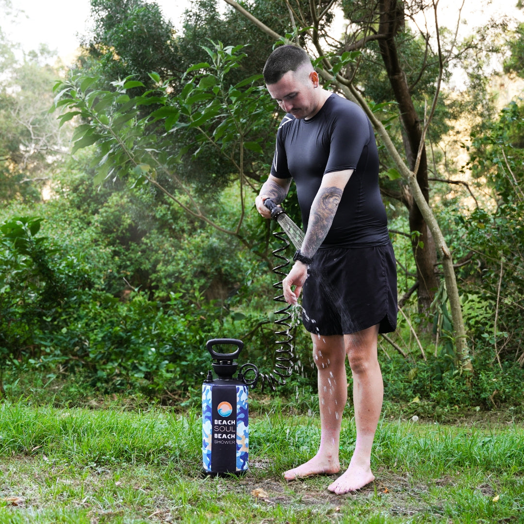 With 8L of pressurised flow, it’s built for trail walkers, wave chasers, and anyone who likes to rinse off without the fuss.
