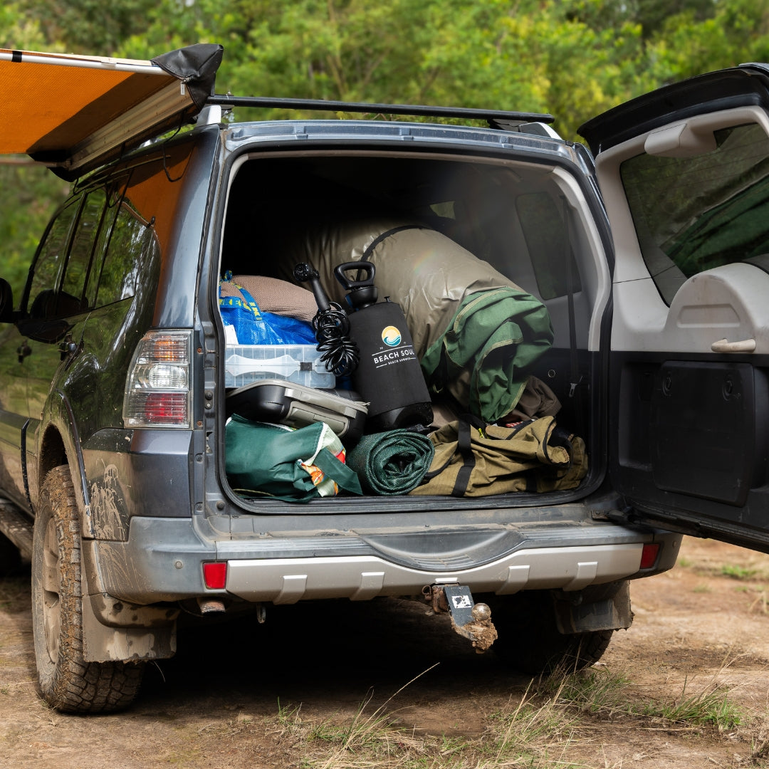 Each shower is pressurised by hand (no batteries needed), includes a 10-mode spray head, and packs easily into your car, van, or day-trip setup. They're built tough for off-grid life — and come with a removable neoprene cover to keep your water warmer, longer.