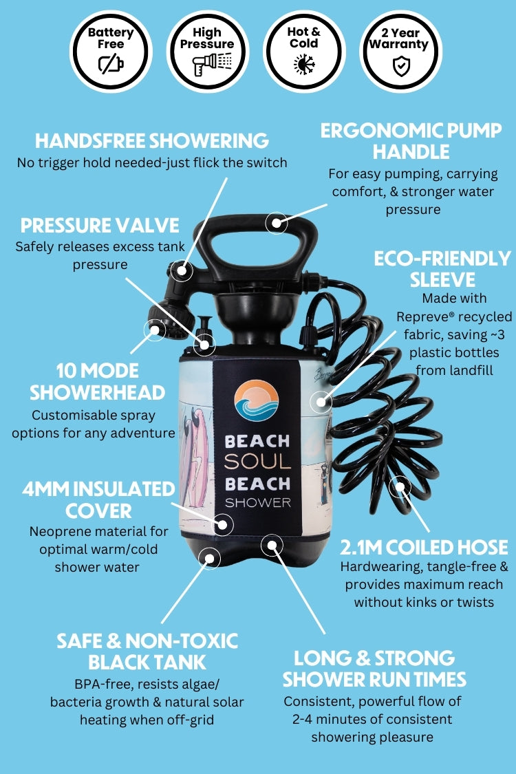 Enjoy the Outdoors with Total Shower Freedom: This surf-loving, vibe-soaked, light-on-your-back portable shower is made for wave chasers, vanlifers, & rinse-and-go freedom.